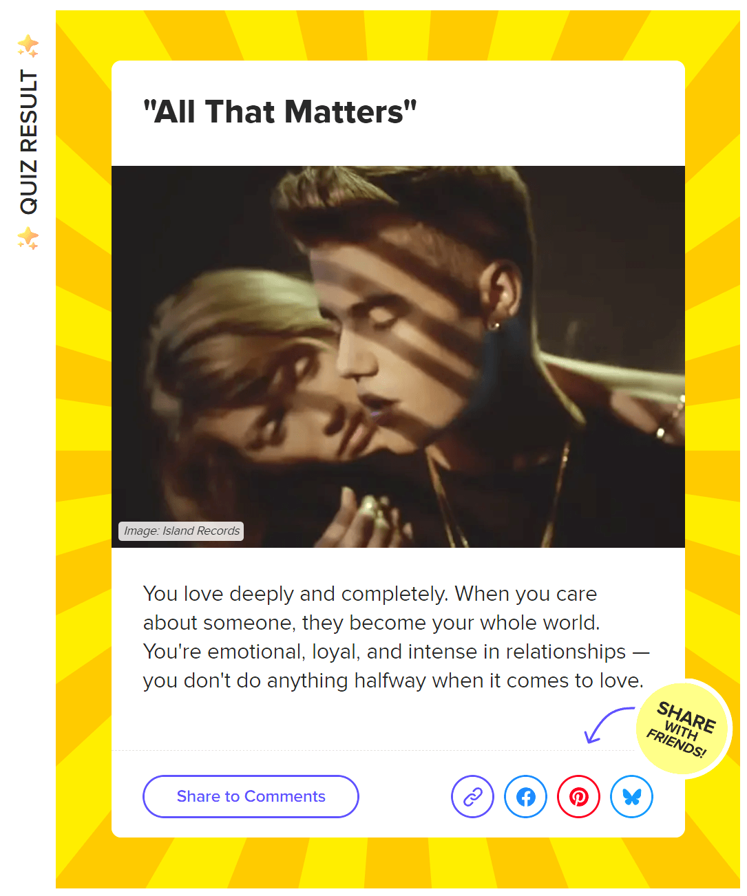 Une question, plusieurs réponses, un résultat marrant que tu envoies à tes potes. Le format est conçu pour le partage : à la fin, gros bouton “Share my result”.