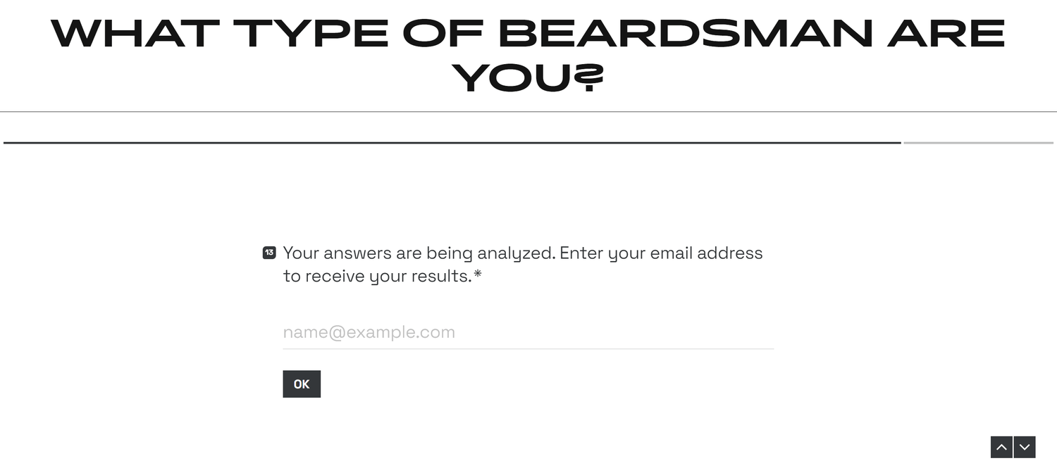Va passer le quiz “What Kind of Beardsman Are You?” sur le site Beardbrand. 7 questions, 6 profils (“The Stylish”, “The Adventurer”, “The Mature”…), un email demandé pour voir ton résultat. Ce quiz a capté 150 000 leads sur Beardbrand, en grande partie grâce au partage organique. Cas documenté pas à pas dans le case study Drip. Pas une pub Meta dédiée derrière.