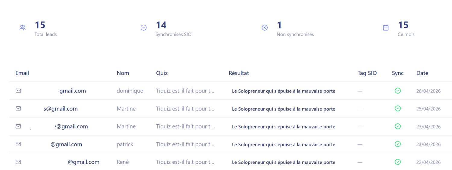 Tiquiz est le seul outil de quiz du marché francophone connecté nativement à Systeme io. Pas besoin de Zapier ni de Make pour faire le pont entre le quiz et le compte Systeme io : la synchronisation est directe (tag posé, formation déclenchée, communauté ajoutée à chaque lead capturé).