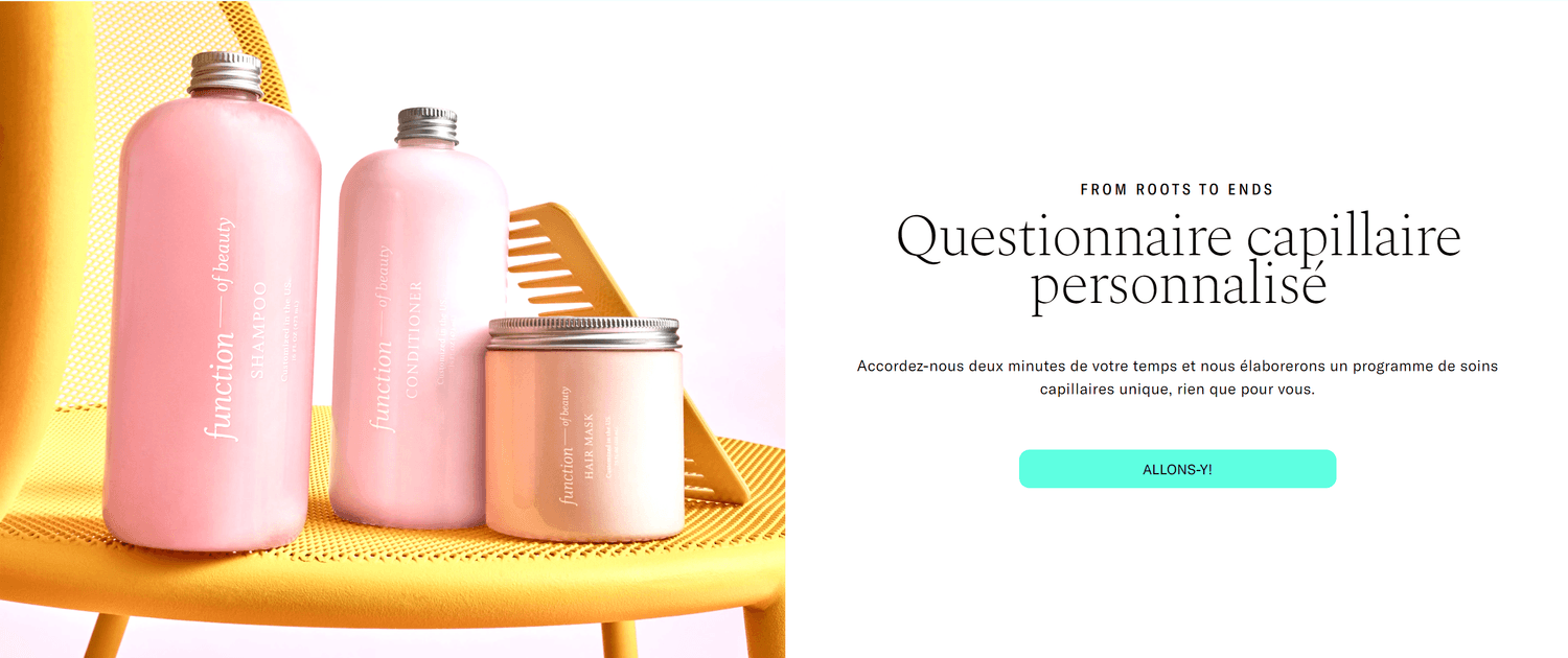 Quiz à 30 questions sur ton type de cheveu, tes objectifs, ton profil. Le résultat : un shampoing formulé pour toi seul. Cross-sell sérum, après-shampoing, masque — tous segmentés par profil quiz. Marque valorisée à plusieurs centaines de millions de dollars, profil documenté dans Forbes et Vogue Business.
