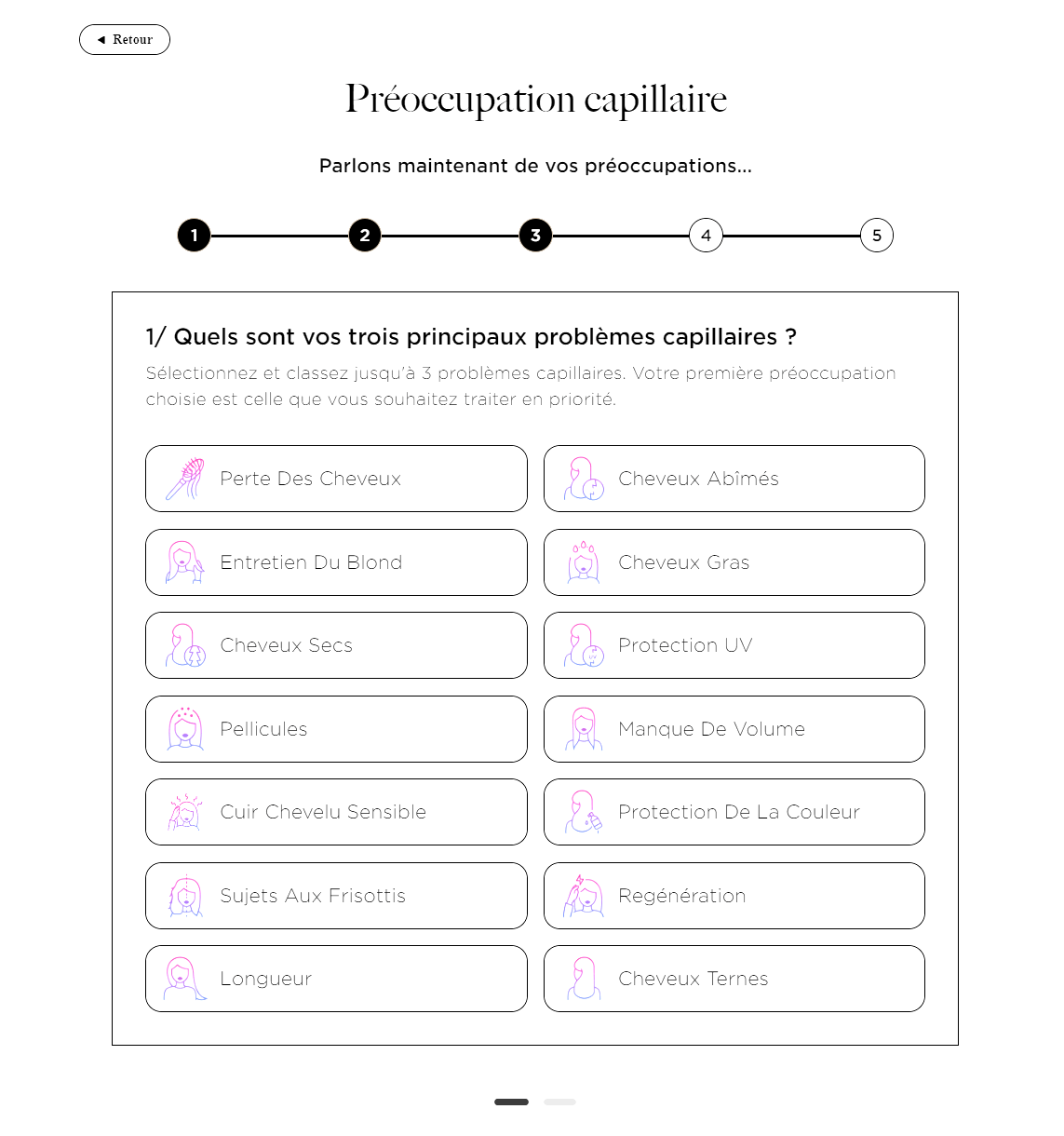 Va passer le Diagnostic Cheveux de Kérastase (groupe L'Oréal). Une quinzaine de questions ultra ciblées : texture de cheveu, porosité, niveau de traitement chimique, fréquence de lavage, exposition à la chaleur, problématiques précises. Pendant que tu réponds, tu te dis "ils ont étudié les cheveux comme personne". Le quiz se termine sur une routine personnalisée avec leurs produits. Kérastase n'a pas besoin de te dire "nous sommes les experts" — chaque question le crie pour eux.