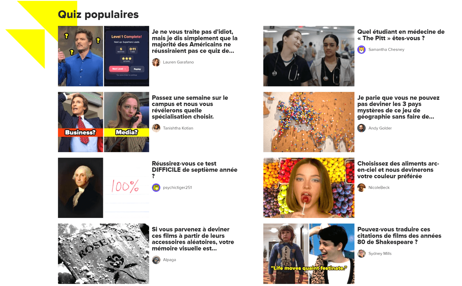 BuzzFeed Quiz — section dédiée du site. Plus de 10 000 quiz publiés depuis le lancement, des milliards de pages vues cumulées (chiffres publiés dans les rapports annuels BuzzFeed Inc.). Le format “Quel X es-tu ?” est devenu un genre culturel. Ouvre Instagram un jeudi soir, tu vois une story de quiz partagée toutes les heures.
